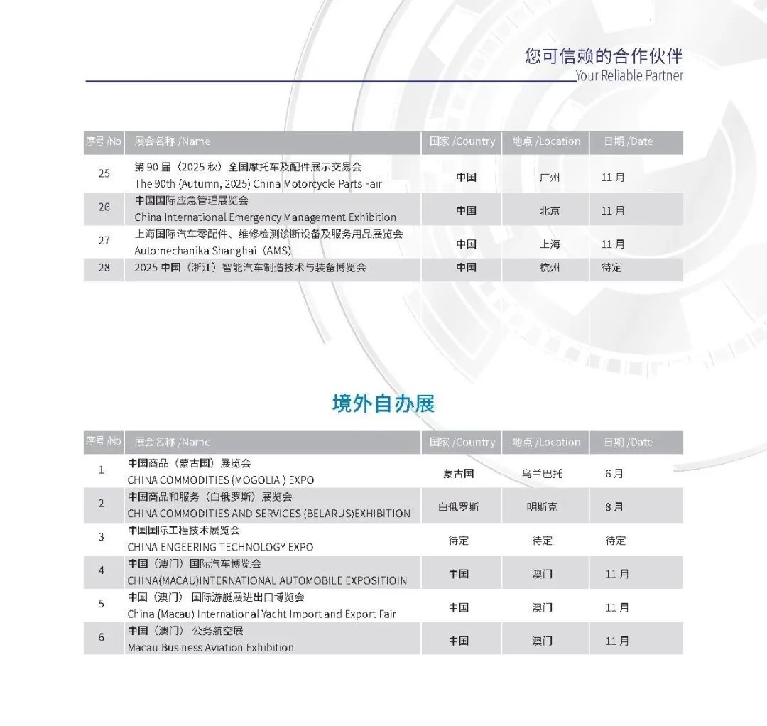 中機國際作為中國會展界唯一擁有70余年歷史的機械會展品牌,擁有“展覽組織、會議活動、運營搭建”等全產業鏈服務,已形成境內自辦展、境外自辦展、出國代理展、會議論壇活動、會展運營、會展工程、整合營銷七大業務板塊。中機國際踐行央企會展使命擔當,積極服務中國國際進口博覽會,中國進出口商品交易會,中國國際服務貿易交易會,中國-東盟博覽會,中國-阿拉伯國家博覽會等最具影響力的國家機制性展會。