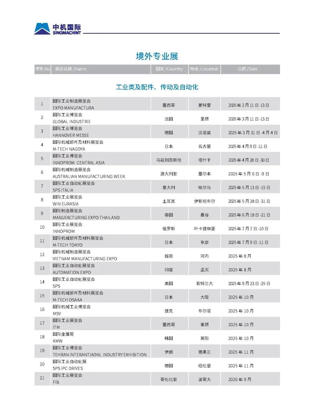 中機國際擁有全球的渠道和網絡,出展足跡遍布100多個國家、300多個城市,累積3100多次國際展覽經驗。中機國際以發展裝備制造業為已任,發揮市場化、專業化、國際化優勢,致力于打造具有核心競爭力的中國一流、世界知名的會展綜合服務商,助力新型工業化、高質量共建“一帶一路”、傳播中國品牌、講好中國故事,致力于成為“中國會展行業的領航者、機械工業發展的貢獻者、對外經貿合作的推動者”。